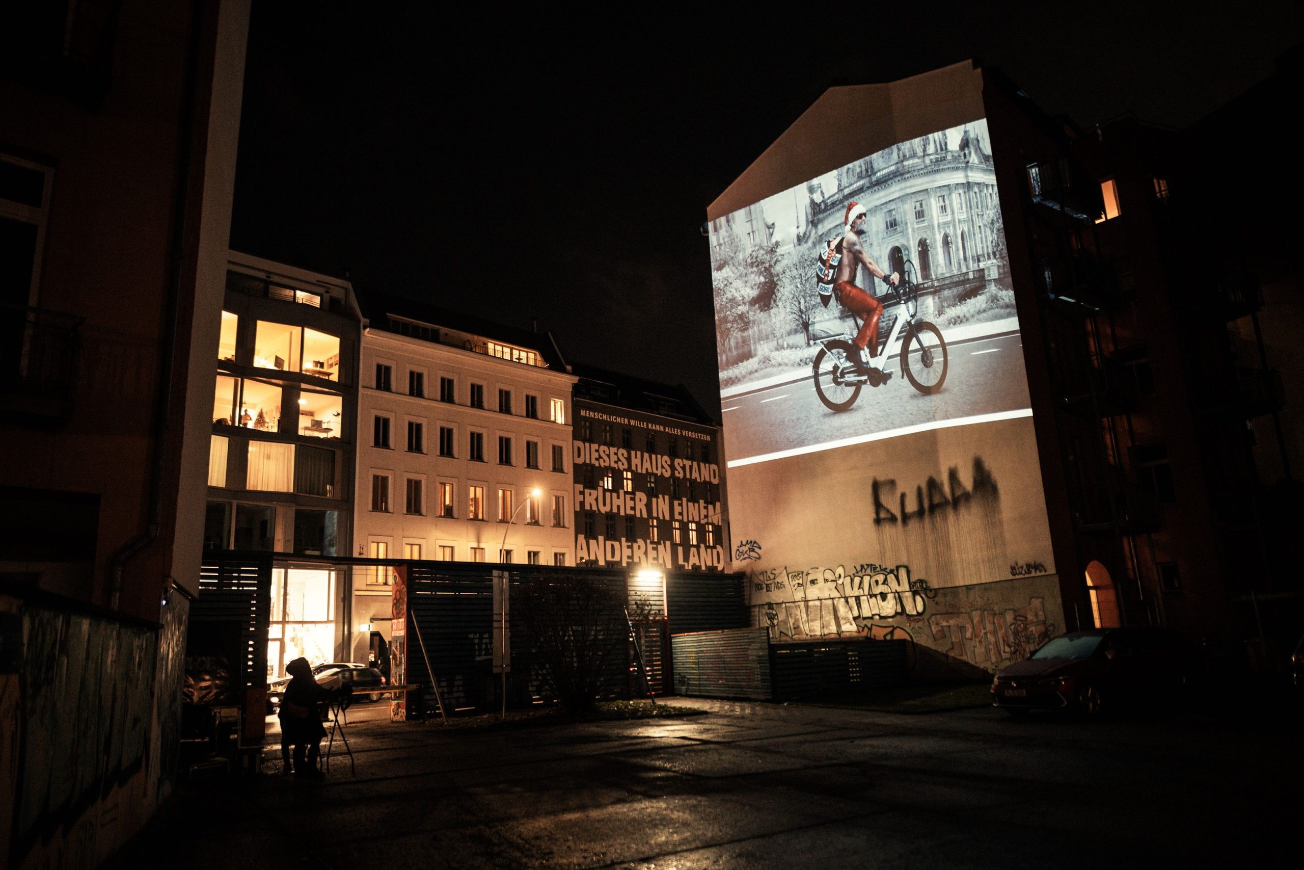 Um die umfangreiche Auswahl an verschiedenen Waren auf der Plattform zu präsentieren, hat sich Gorillas mit Paper Trails für eine Kampagne mit dem Titel „Naughty Santa“ zusammengetan. Die Kampagne fand in den dunklen, winterlichen Straßen Berlins bei Nacht statt und nutzte die Kunst der Wild Projektion, um diese Angebote auf Gebäuden in der Nähe der bekannten Berliner Ausgehviertel zu präsentieren.