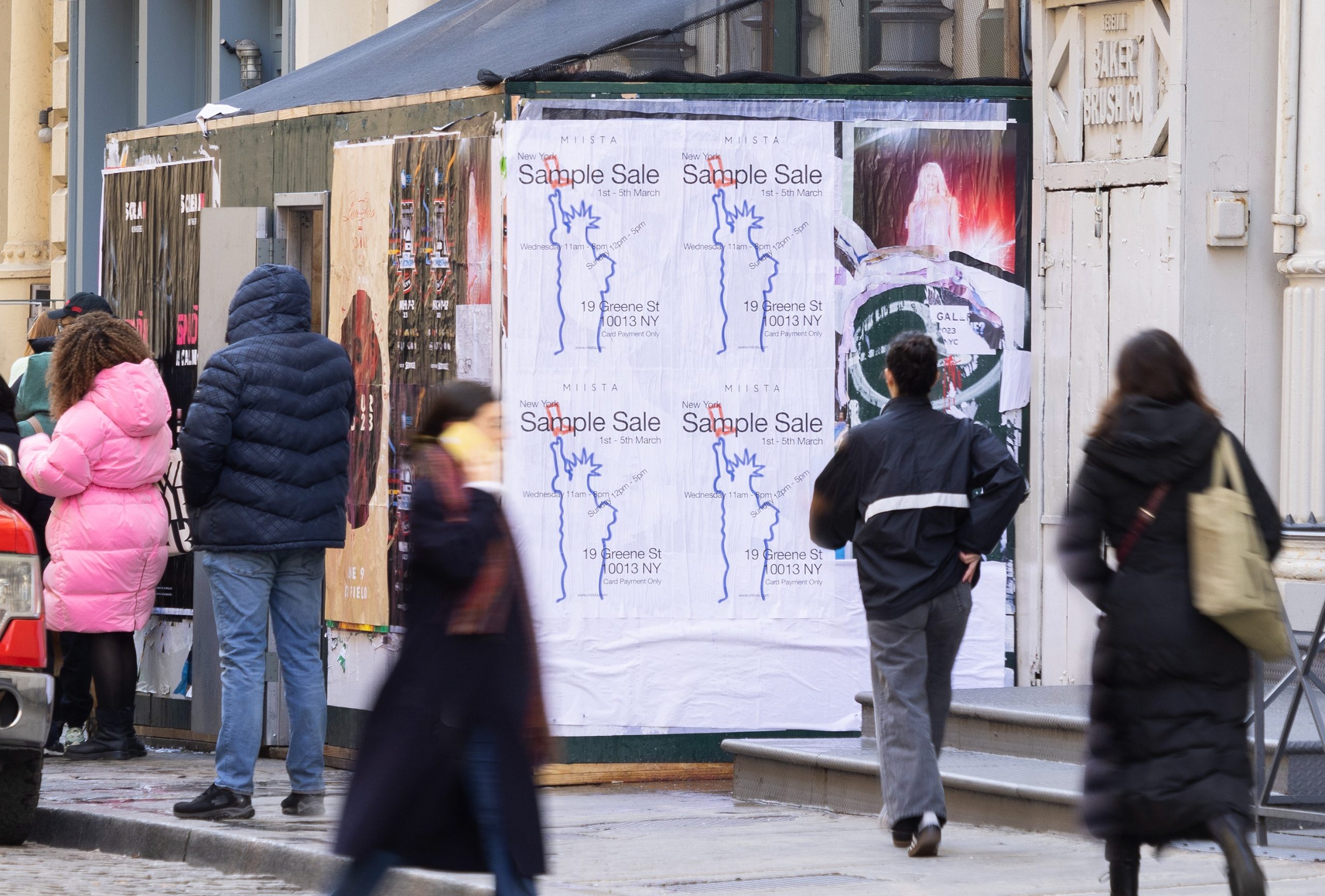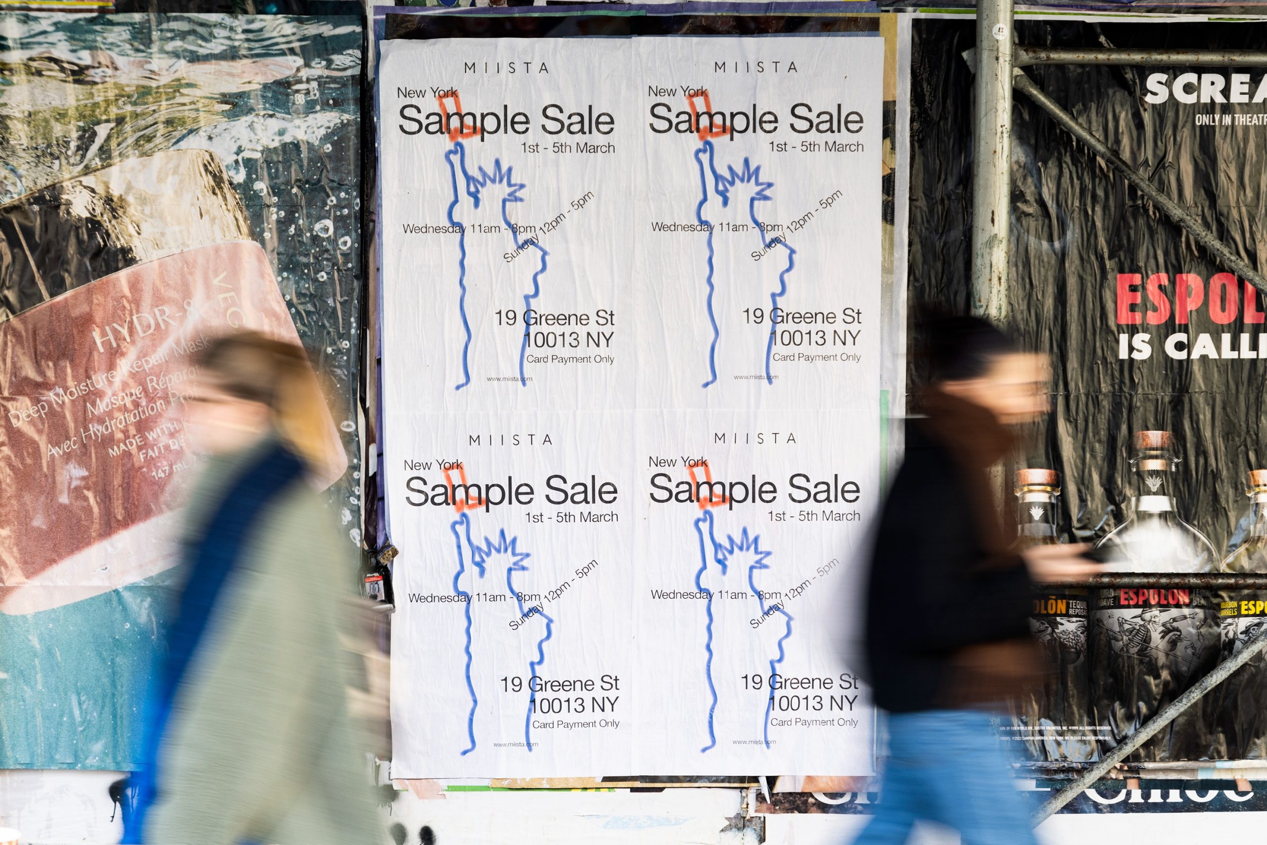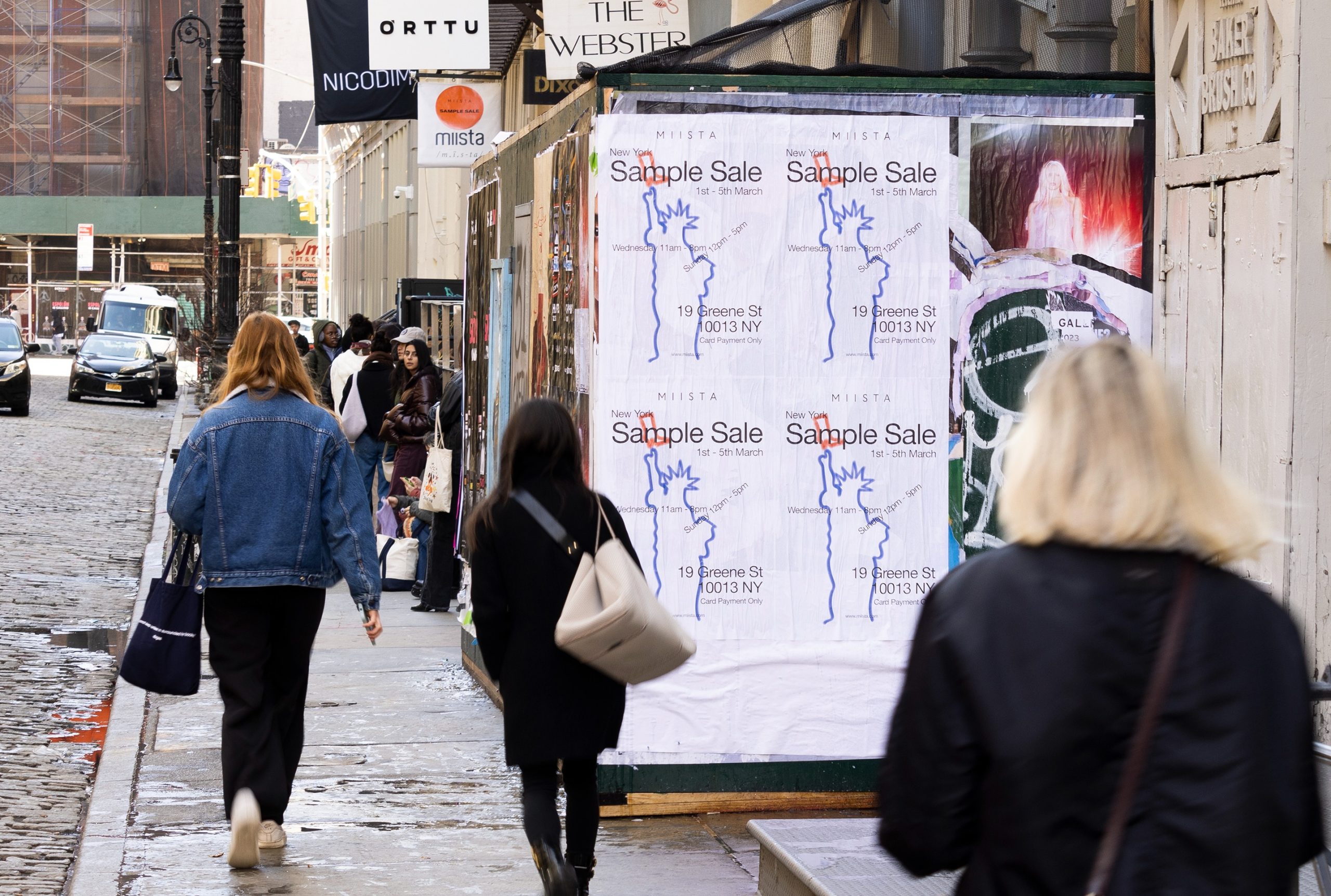 Für die verschiedenen Pop-up-Stores, in denen Miista in den Jahren 2022 und 2023 verkauft, hat Paper Trails Europe in Berlin und New York eine Reihe von wilden Plakatkampagnen gestartet. In Berlin wurden Plakate im Format A1 und in York Plakate im Format 36*24 für die verschiedenen Wild-Plakatier-Flüge verwendet.