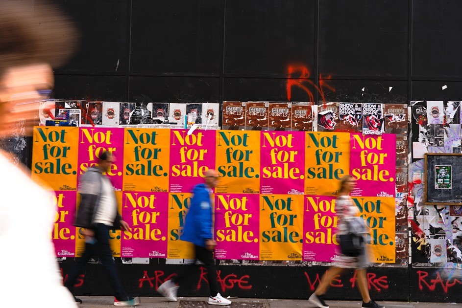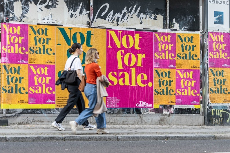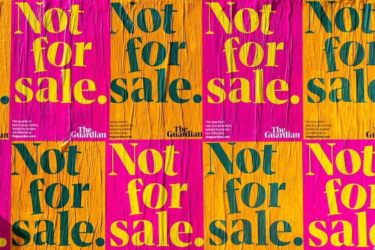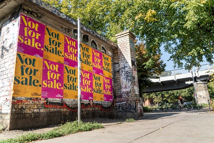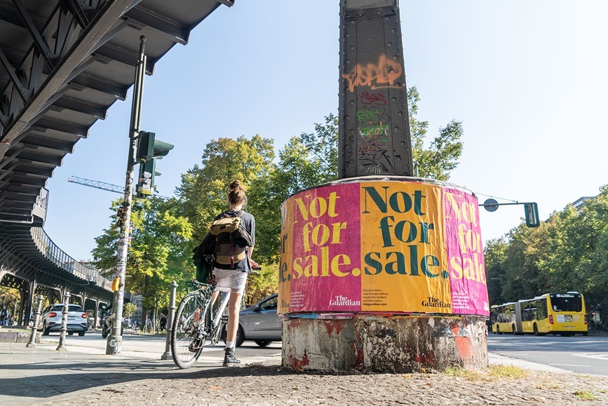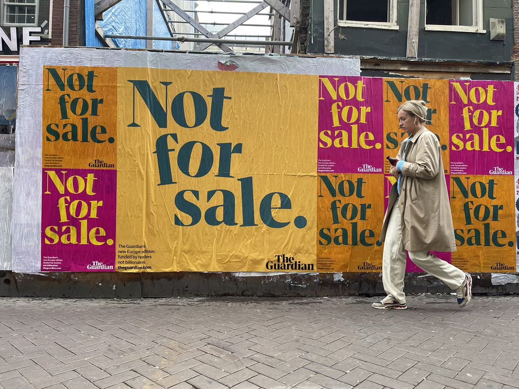 In Zusammenarbeit mit Paper Trails hat The Guardian zwei unterschiedliche Werbekampagnen vorgestellt, die beide die „Not for Sale“-Erklärung in Amsterdam, Berlin und Dublin prominent in Szene setzen. In Amsterdam wurden in einer wilden Plakatkampagne B1-Plakate in der ganzen Stadt sowie XL-Plakate im Stadtzentrum aufgehängt. In Berlin wurde eine Kombination aus A1- und größeren ABRI-Plakaten in der Wild-Plakatier-Kampagne verwendet, während in Dublin A1-Plakate in der ganzen Stadt zu sehen waren, die die entschlossene Botschaft von The Guardian wirksam vermittelten.
