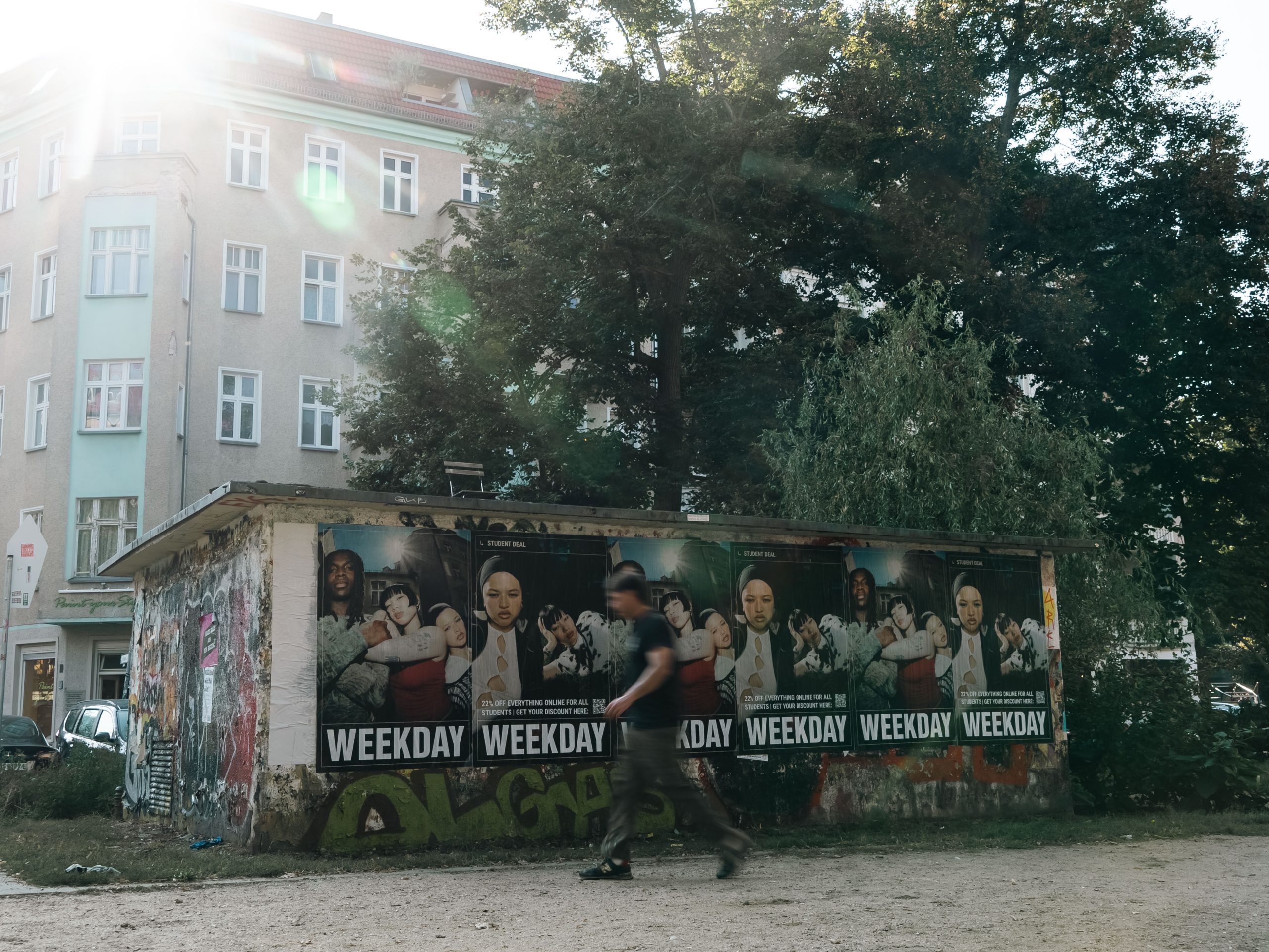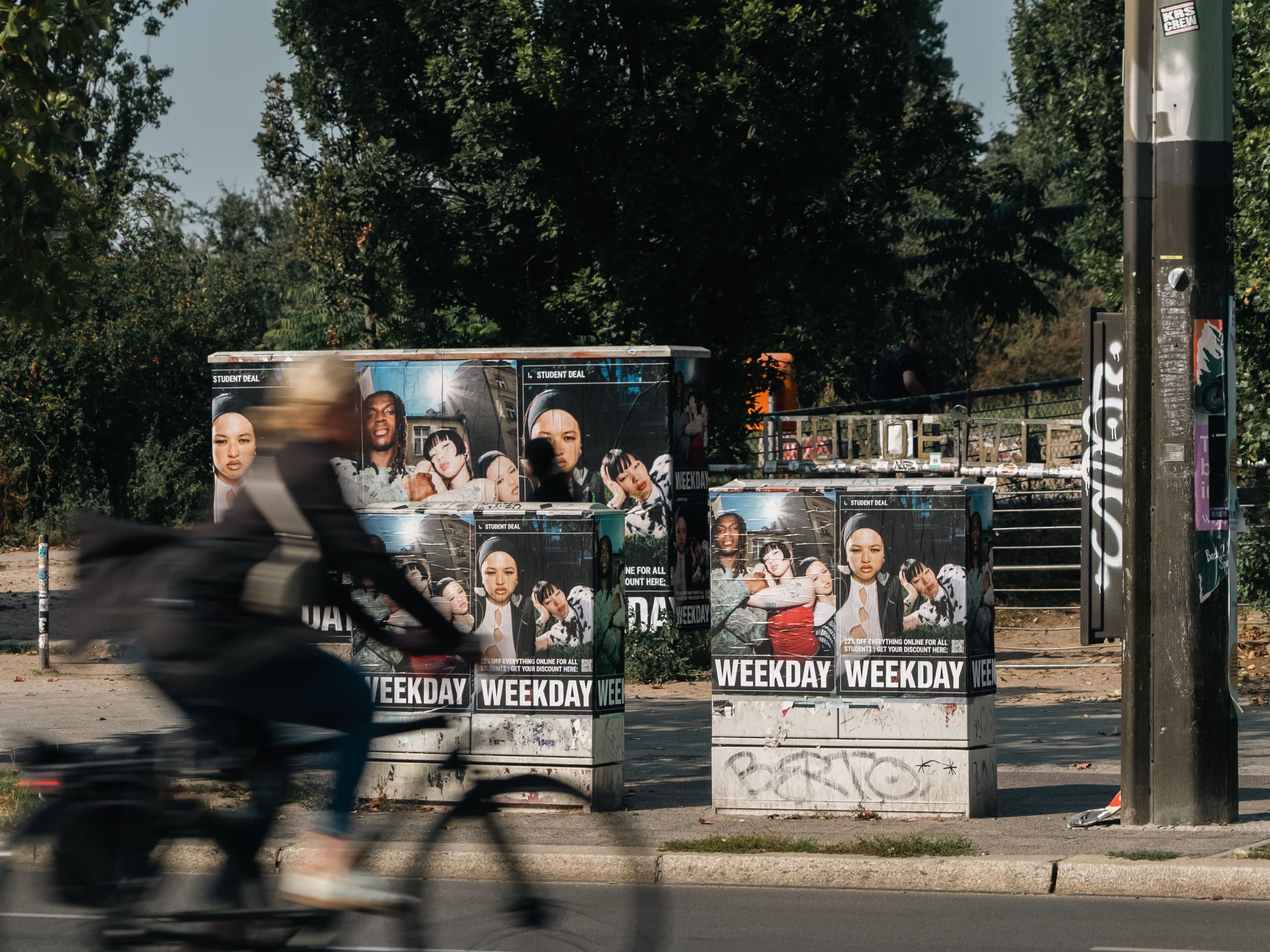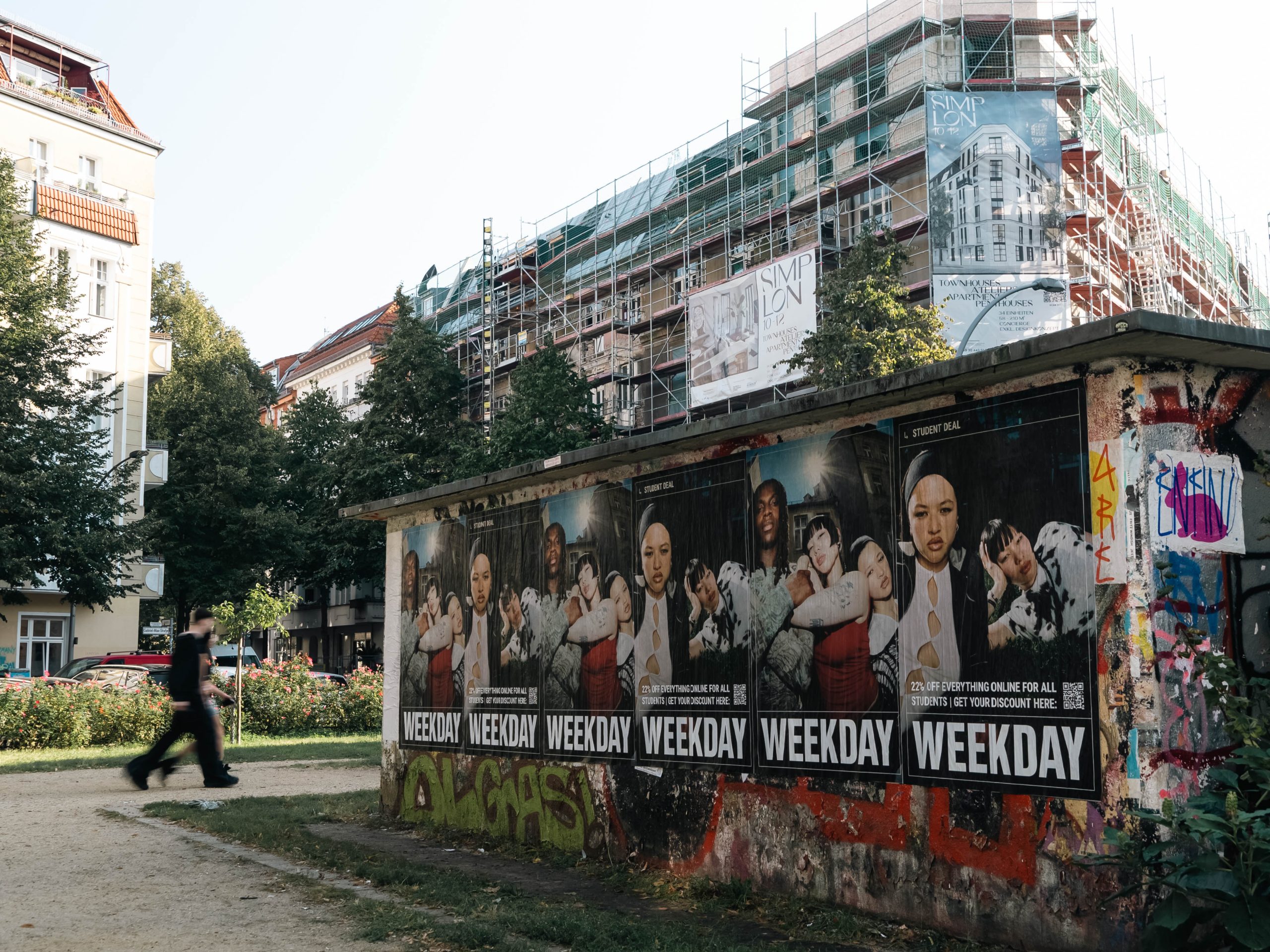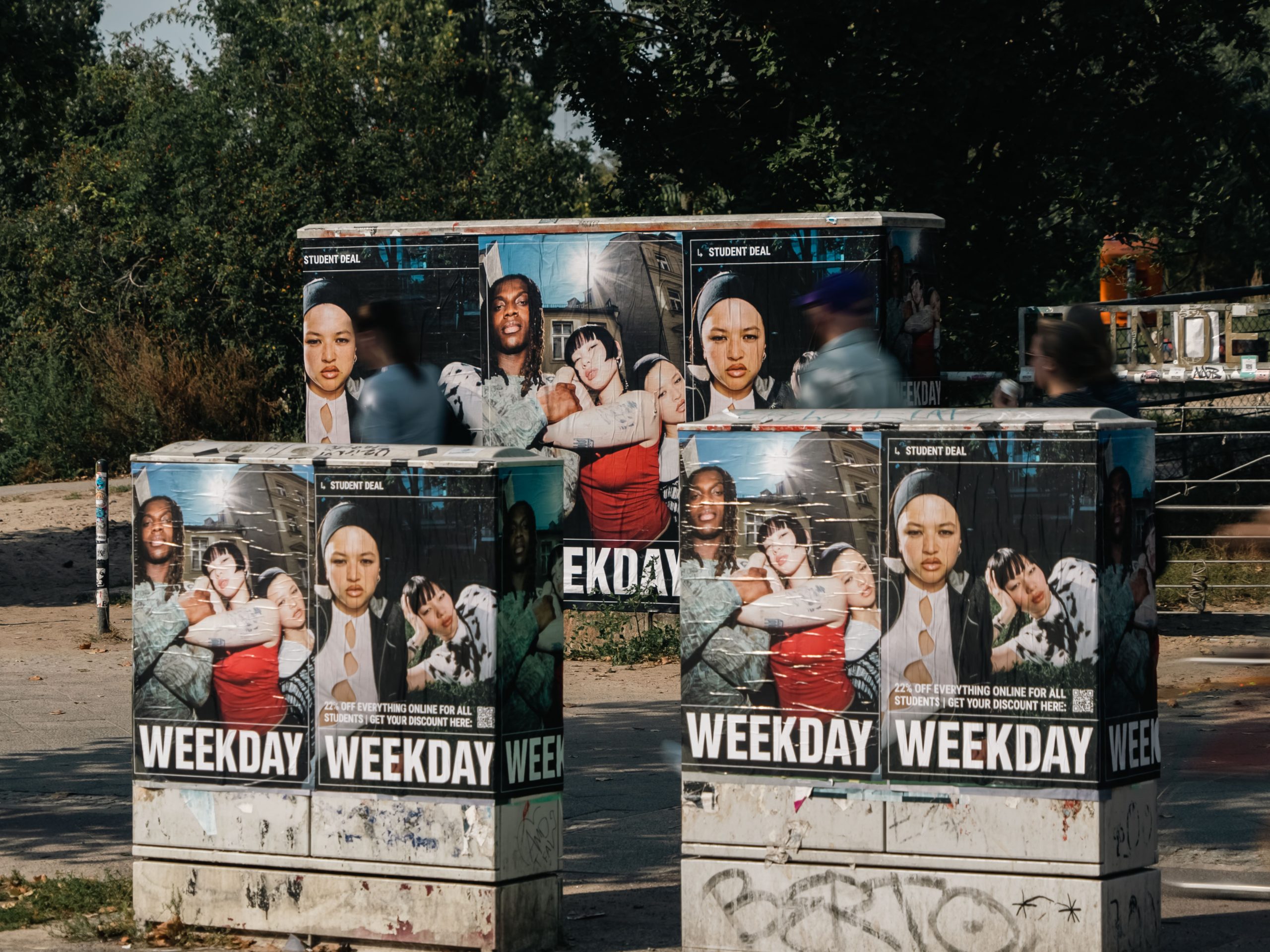 Diesen September arbeitete Paper Trails mit dem Kleiderhersteller WEEKDAY zusammen. Die Mission war es Berlin auf den Student*innen Rabatt aufmerksam zu machen. Dafür wählten wir eine Mischung zwischen A1 und ABRI Postern. Die farbigen Motive kreierten einen einzigartigen Look und ergänzten die wilde Stadtlandschaft Berlins perfekt.